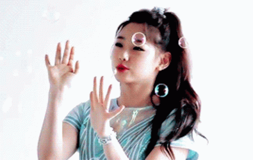 K-pop idol Kang Mina playfully interacts with soap bubbles, smiling brightly and catching them on her hands.