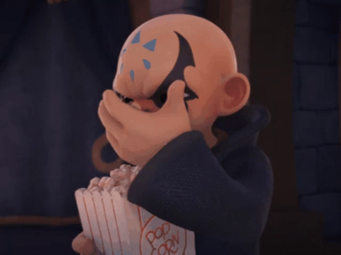 Skylanders character Kaos mischievously enjoys a box of popcorn, likely plotting his next move.