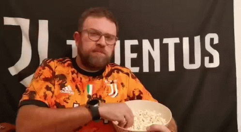 Leomina enjoying popcorn while wearing a Juventus jersey, with a Juventus flag in the background.