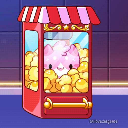A cute pink cat enjoys a cozy time inside a popcorn machine, surrounded by fluffy popcorn.