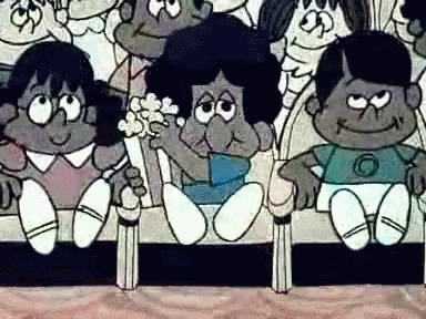 Cartoon children happily watching a movie and eating popcorn in a theater.