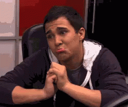 A young man sits with hands folded, making a pleading and sad expression, saying 'Por Favor'.