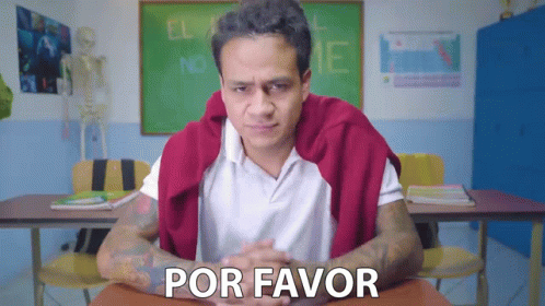 A man with 'POR FAVOR' written on his shirt, sitting at a classroom desk and begging with clasped hands.
