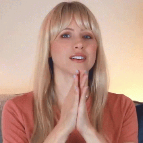 Superholly in a moment of prayer, looking up with hands clasped, wearing a pink shirt.