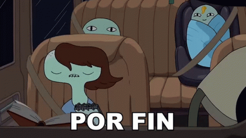 A character from Hora de Aventura (Adventure Time) in a car with 'POR FIN' text.