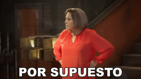 Lorena from Vecinos emphatically says 'Por Supuesto' (Of Course) with outstretched arms.