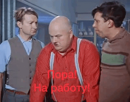 Three men, including one in a red striped shirt, are told "Time! To work!" in Russian.