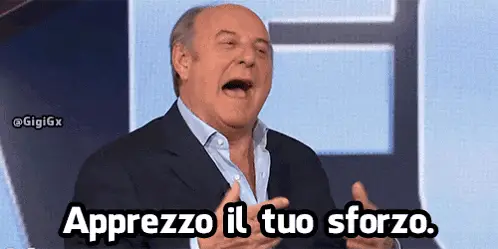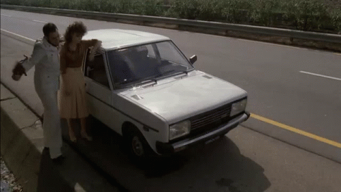 Carlo Verdone's character, Furio, shouts 'Porco Giudaccio Infame!' next to a white car with a woman.