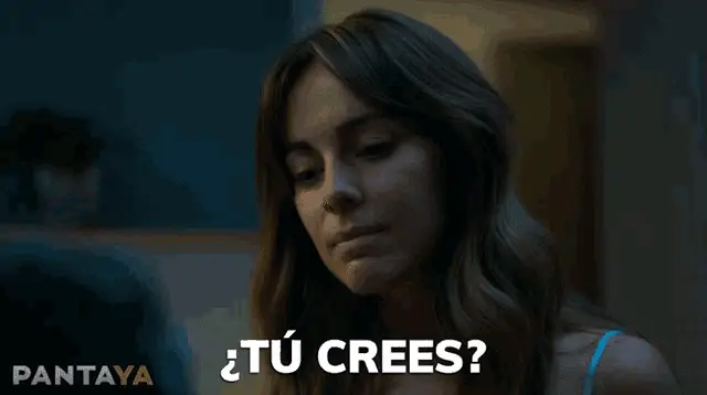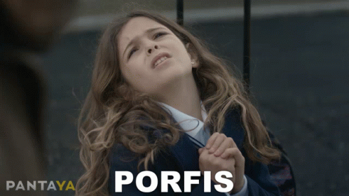 Young Camila, played by Manuela Rojas, makes an adorable pleading face, saying 'Porfis'.