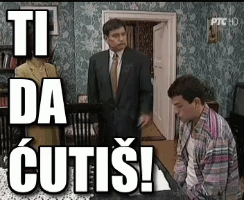 A man in a suit emphatically tells another man to 'shut up' in a scene from the Serbian TV series Porodicno Blago.
