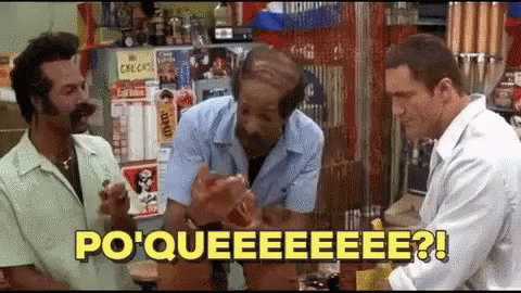 A man dramatically asks 'Why?!' in a bar setting, with two other men watching his intense reaction.
