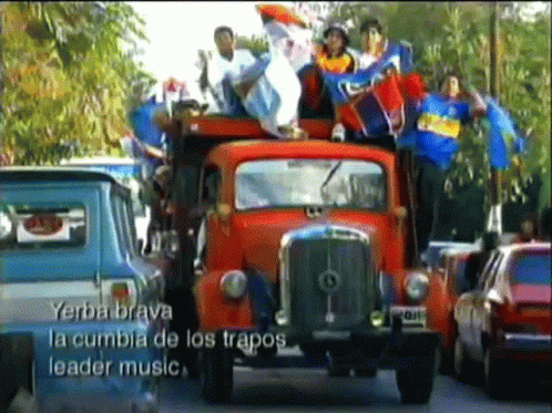 Fans of Yerba Brava cheer from a red truck, waving flags to the rhythm of 'La Cumbia De Los Trapos'.