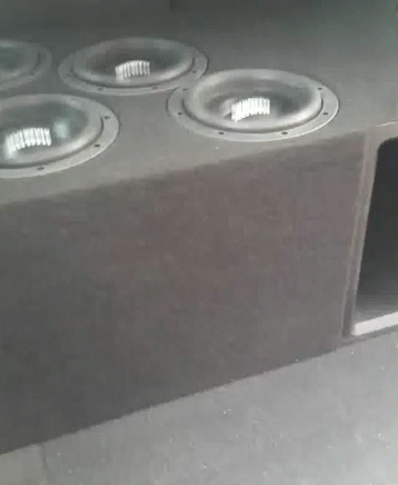 Powerful subwoofers vibrating intensely in a custom box, showcasing a Porsche Bassheads setup.
