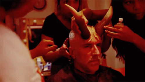 A man from Porta Dos Fundos getting devil horns applied as part of a makeup process.