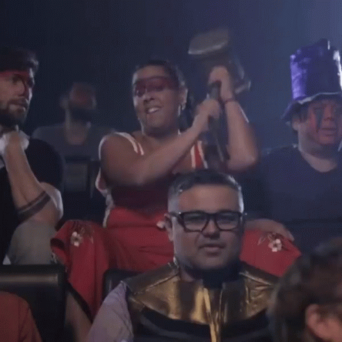 Porta Dos Fundos fans dressed as Thor and Thanos, reacting in a dark room.