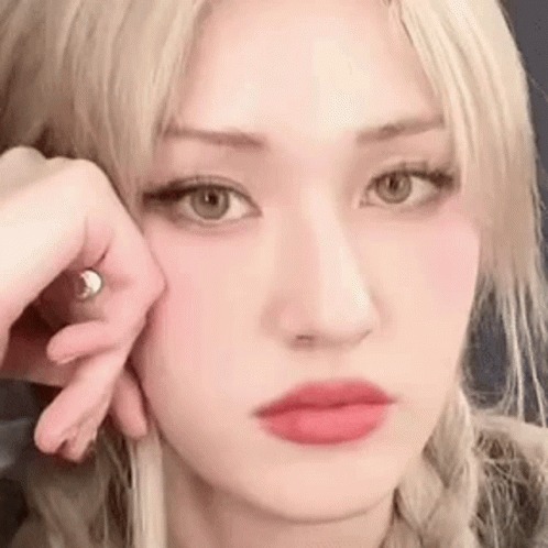 K-pop idol Somi rolls her eyes, looking exasperated or playful, with her hand resting on her face.