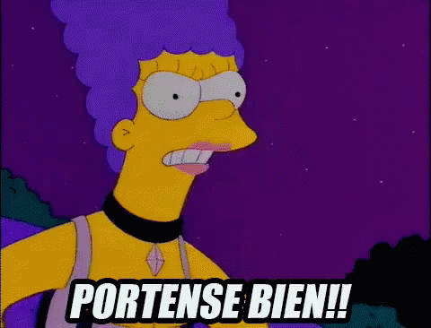 Marge Simpson scolds her family, pointing her finger and telling them 'Portense Bien!' (Behave yourselves!).