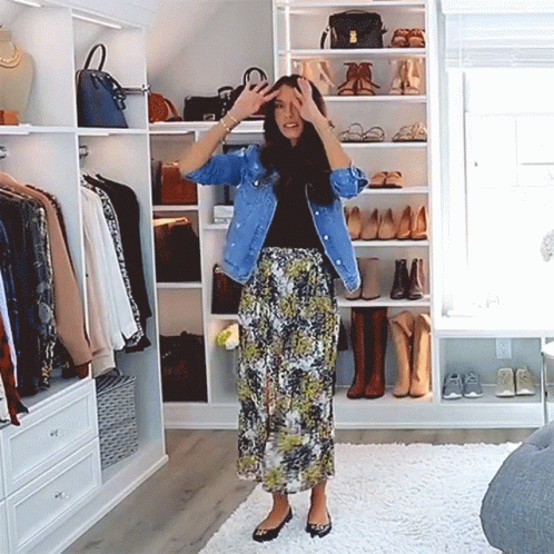 Shea Whitney poses stylishly in her walk-in closet, showcasing a denim jacket and floral skirt.