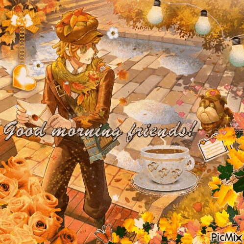 Victor Grantz from Identity V, the postman, wishes 'Good morning friends!' in an autumn-themed scene.