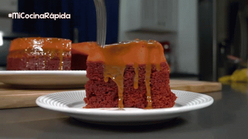 A delicious slice of Red Velvet Chocoflan with caramel sauce being cut from a larger cake.
