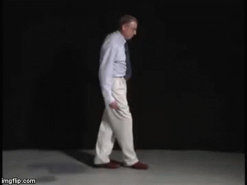 Man in white shirt and tie performs a posture dance, demonstrating balance and body control.