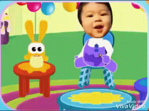 A baby's face superimposed on a cartoon character celebrating a birthday with cake and other animated friends.