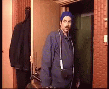 Dmitry Nagiev from Ostorozhno, Modern! in a blue jacket and hat, delivering the iconic line 'Po Kochanu!'.