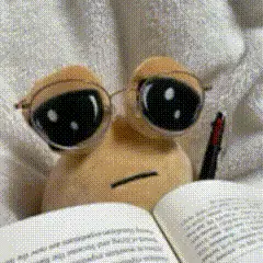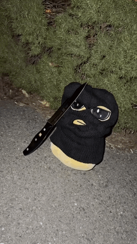A collection of Pou plush toys, one initially shown with a knife, gathered outdoors.
