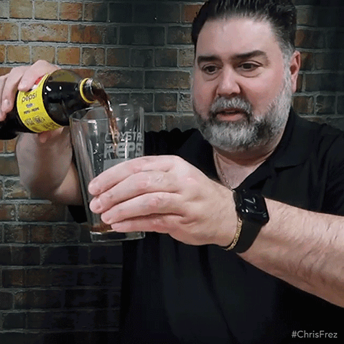Chris Frezza pours a dark beverage from a Pepsi bottle into a 'Crystal Pepsi' glass.