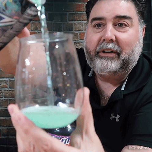 Chris Frezza pours a vibrant blue-green sparkling beverage into a wine glass, looking at the camera.