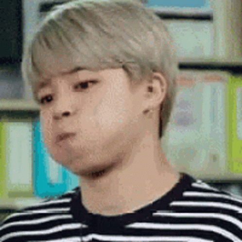 BTS member Jimin makes a cute, funny pout face while wearing a striped shirt.