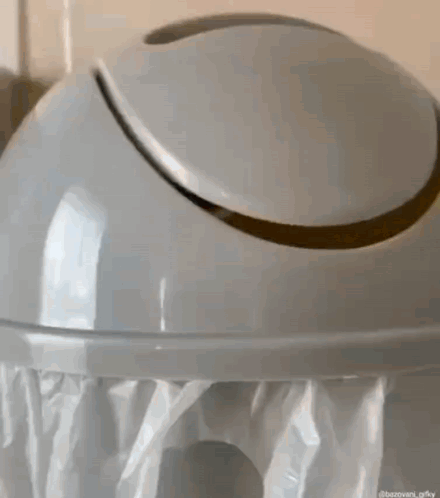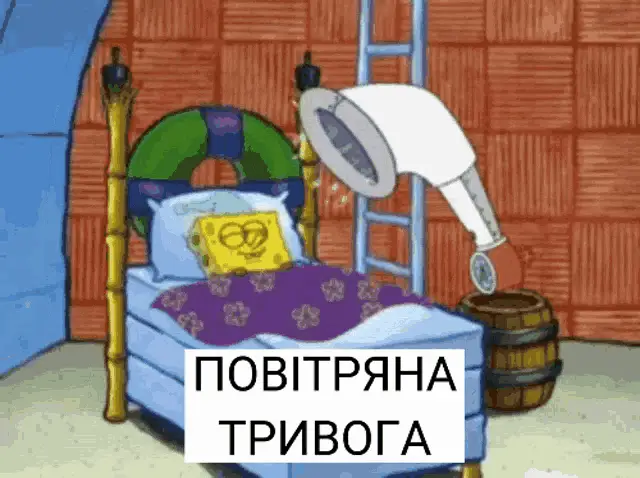 A cute parrot hides inside a trash can, acting as a shelter during an air raid alert.