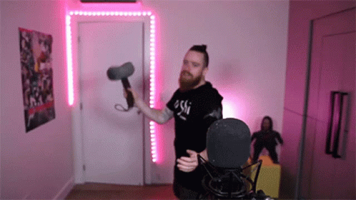 A bearded man from Luba Tv creates a "Pow Martelada" hammer effect with smoke and a microphone.