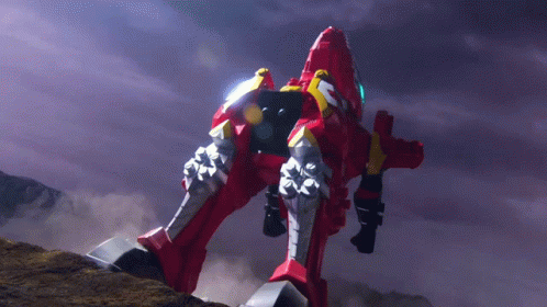 The powerful Power Rangers Dino Fury Megazord stands tall, crackling with intense red lightning and energy.