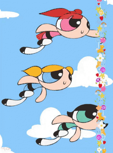 The Powerpuff Girls, Blossom, Bubbles, and Buttercup, fly through the sky in both classic and anime styles.