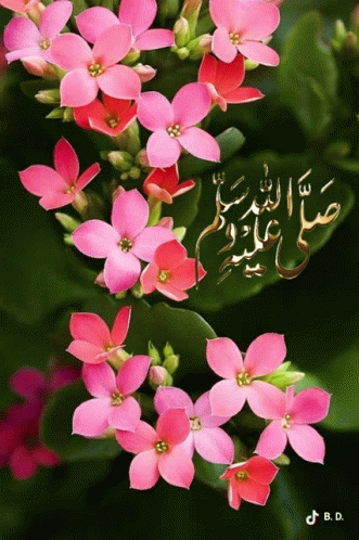 Vibrant pink and red flowers with golden Arabic calligraphy, 'Sallallahu alaihi wa sallam', on a lush green background.