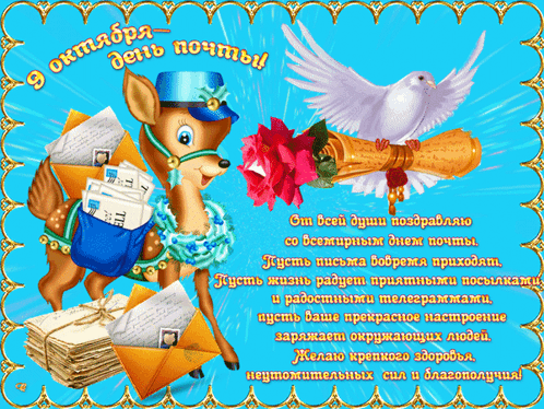 A vibrant greeting card celebrating World Post Day, featuring a cute fawn, a dove, and numerous letters.
