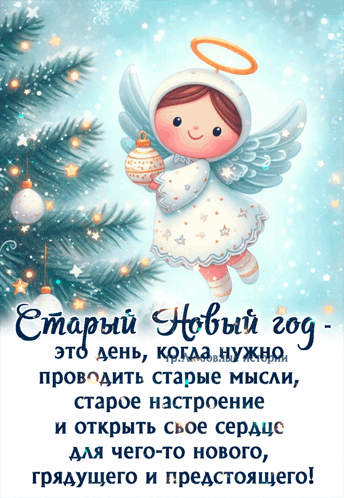 A festive Russian greeting card for Old New Year featuring a cute angel holding a Christmas ornament.