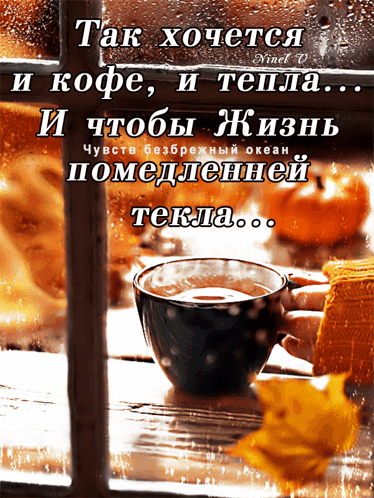 A cozy scene with a cup of coffee by a window, featuring a Russian quote about warmth and a slower life.