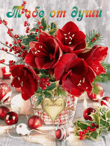 A beautiful festive arrangement of red amaryllis and holly with a golden heart, conveying a sincere wish.