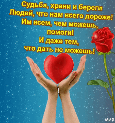 Hands gently holding a red heart, with a beautiful red rose and a heartfelt Russian message about fate and protection.