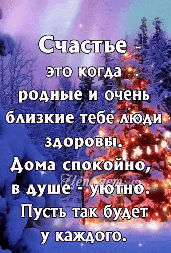 A beautiful winter scene with a decorated Christmas tree and a heartwarming Russian wish for health and coziness.