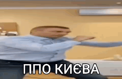A man, likely Vitali Klitschko, comically mimics air defense actions in a room with overlaid text.