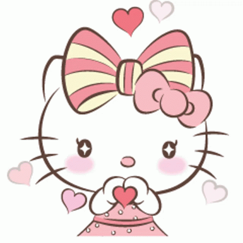 Cute Hello Kitty winking and blowing kisses, holding a heart, wearing a pink dress and bow.
