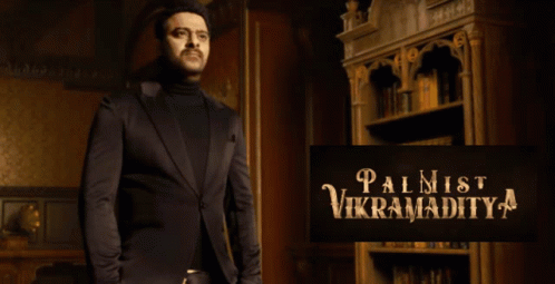 Prabhas, dressed in a suit, stands before the 'Palmist Vikramaditya' title card, hinting at his role in Radhe Shyam.
