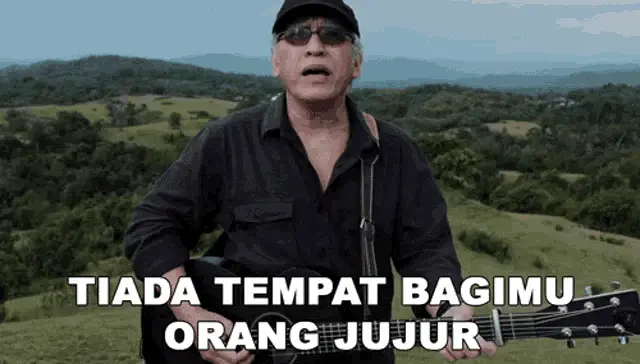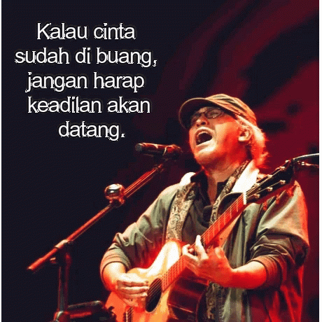 Iwan Fals performs, with a quote about justice, referencing Indonesian political figures Prabowo and Jokowi.
