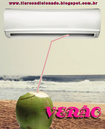 A refreshing coconut drink on a sunny beach, with an air conditioner for ultimate summer cool. Perfect for 'Verão'.