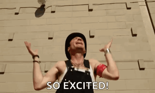 Glen from Letterkenny throws his hands up in excitement, exclaiming 'SO EXCITED!'