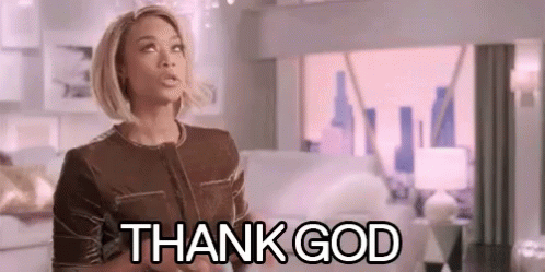 A woman from Basketball Wives raises her hands in relief with the text 'THANK GOD' overlaid.