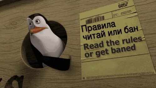Skipper the penguin from Madagascar next to a sign warning to 'Read the rules or get banned'.